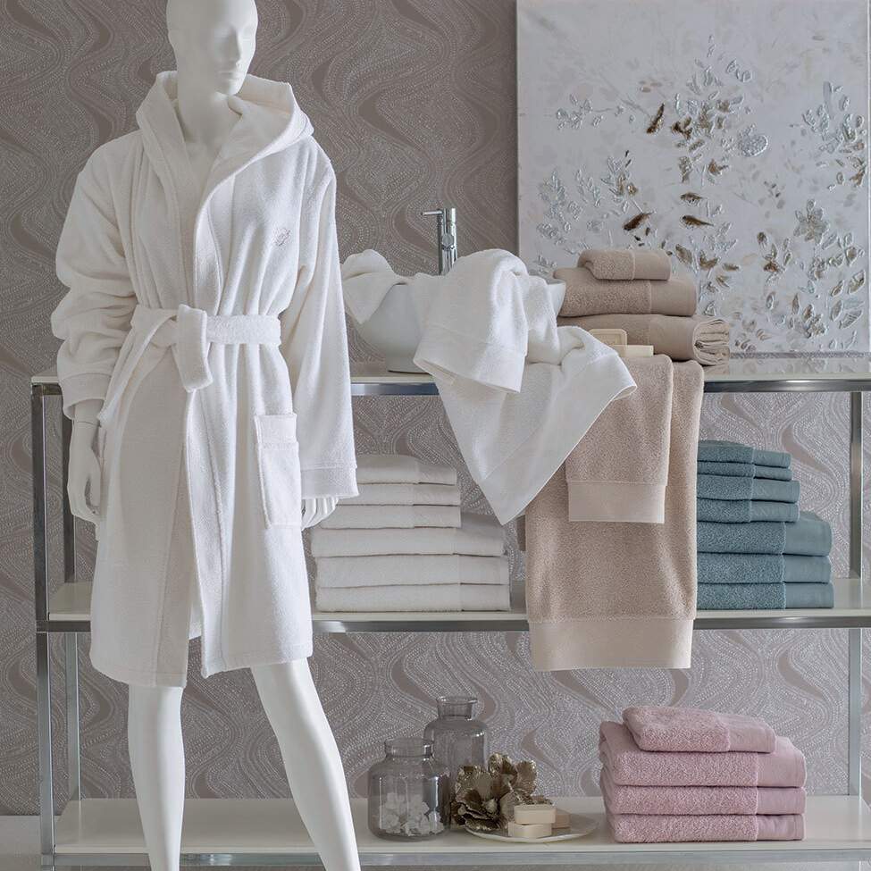 Disponibile in quattro varianti di colore: ecrù, bianco, fard e acquamarina.