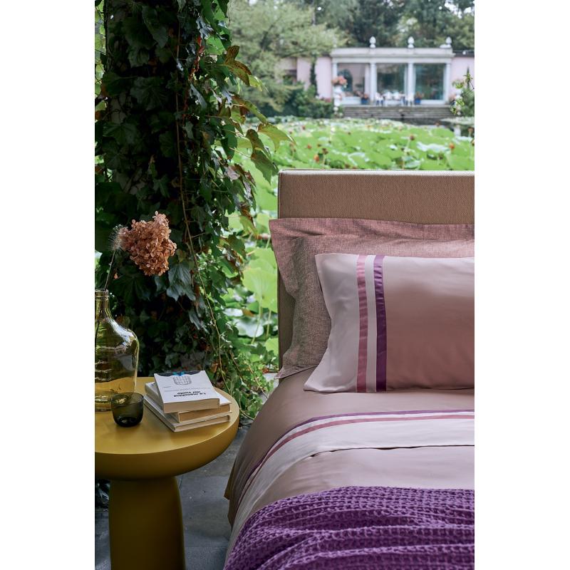Lenzuolo Kubric in rasatello di puro cotone, impreziosito da federe e balza a fasce di diverso colore, per un'eleganza e una sobrietà senza eguali.